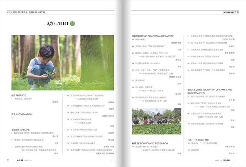 《幼儿100》杂志的内容主要分为以下几个方面:幼儿园教育话题、益智游戏与儿童文学、亲子互动板块等。每期杂志都会组织专业的编辑和采访团队,深入挖掘幼儿的身心特点和发展规律。同时还会探讨幼儿园教育与家庭教育之间的关系,以及如何促进幼儿个性发展和健康成长等议题。此外,杂志还会举办各类线上线下活动,例如幼儿园教育研讨会、亲子活动等,为读者提供更加丰富的幼儿教育体验和交流机会。