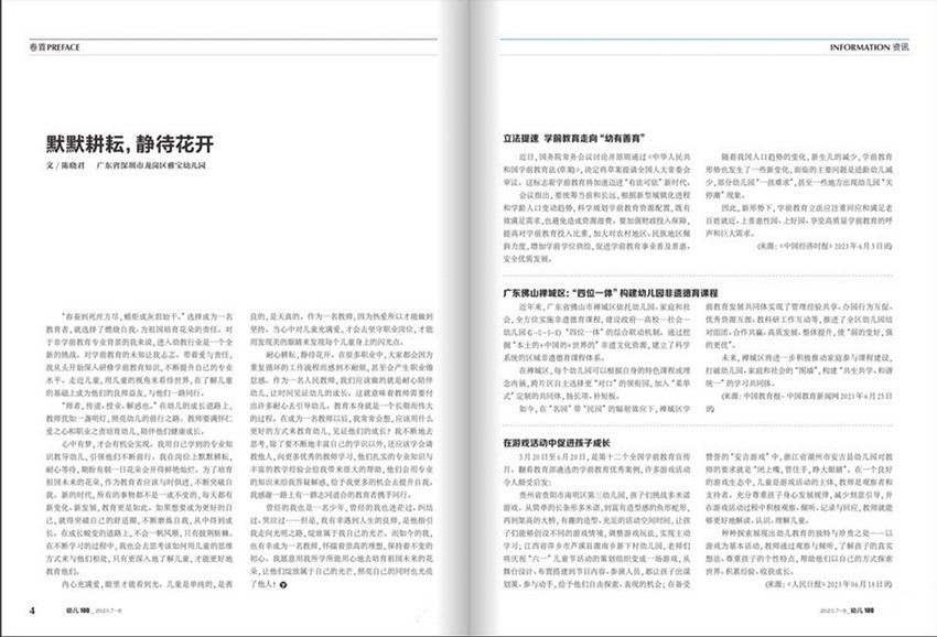 杂志主要关注幼儿园教育、家庭教育、亲子互动等领域,每期杂志都会发布适合幼儿身心发展的话题、游戏和故事等内容,包括儿童文学、益智游戏、科普知识等方面。同时还会推出亲子共读的板块,为家长和孩子提供亲子互动的机会。此外,杂志还会介绍各类幼儿园和家庭教育的方法和经验,帮助读者更好地了解和掌握幼儿教育的技巧。